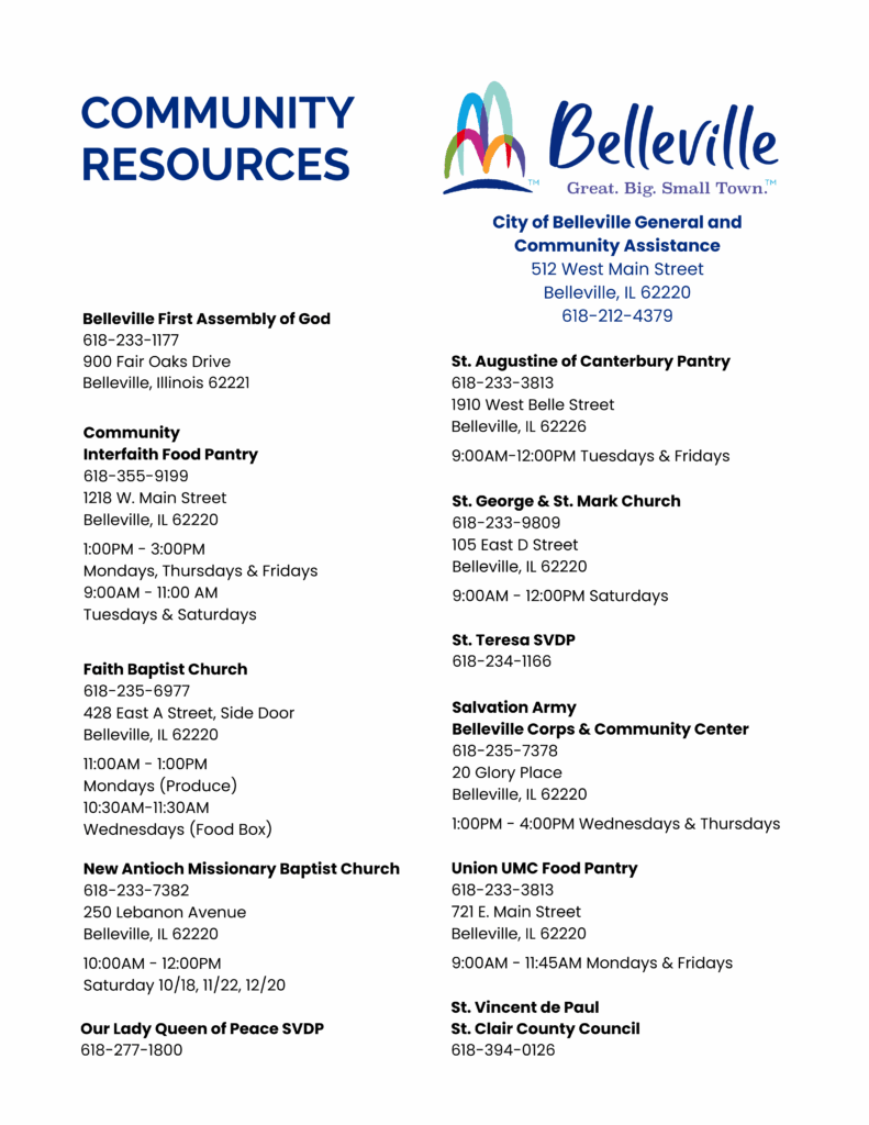 The City of Belleville General and Community Assistance office is located at 512 W. Main Street. Case managers are available Monday – Friday from 8 a.m. to 12 p.m. and 12:30 p.m. to 4:30 p.m. The office is closed on legal holidays. For more information or to schedule an Intake Appointment, call 618-212-4379.