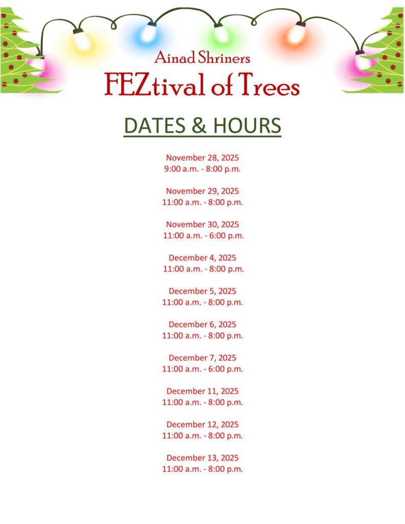 The Nobles and Ladies of Ainad Shriners have begun planning and preparations for its Third Annual Ainad Shriners FEZtival of Trees set for November 28 – December 13, 2025. The FEZtival of Trees will be held at 23 Public Square, Belleville, Illinois, and will be open to the public.
