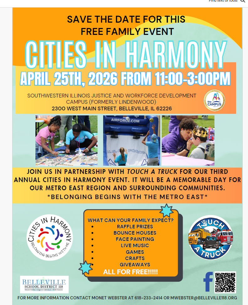 JOIN US IN PARTNERSHIP WITH TOUCH A TRUCK FOR OUR THIRD ANNUAL CITIES IN HARMONY EVENT. IT WILL BE A MEMORABLE DAY FOR OUR METRO EAST REGION AND SURROUNDING COMMUNITIES. WHAT CAN YOUR FAMILY EXPECT? RAFFLE PRIZES, BOUNCE HOUSES, FACE PAINTING, LIVE MUSIC, GAMES, CRAFTS, GIVEAWAYS, AND MULTIPLE TRUCKS TO TOUCH AND CLIMB THROUGH, ALL FOR FREE!FOR MORE INFORMATION CONTACT MONET WEBSTER AT 618-233-2414 OR MWEBSTER@BELLEVILLE118.ORG.