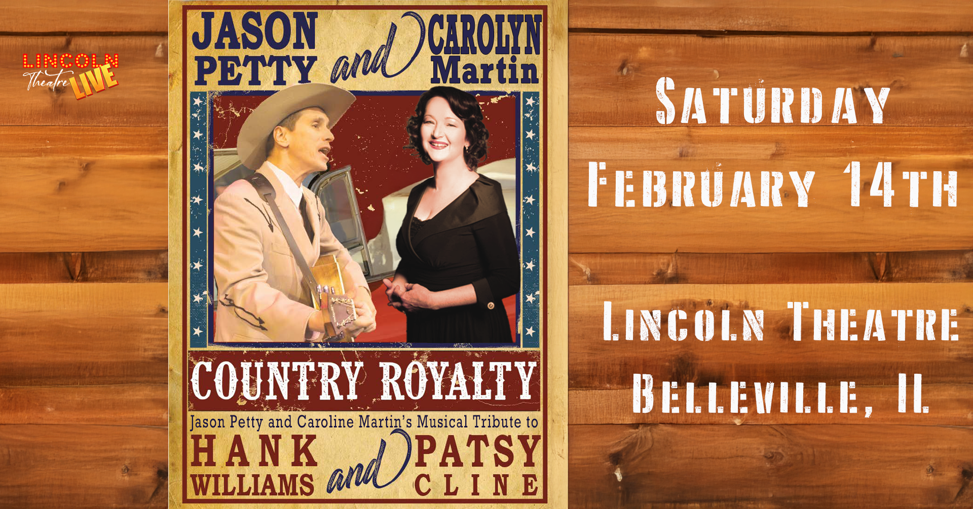 Jason Petty re-creates the role he has become famous for, while Carolyn Martin gives jaw-dropping performances of Patsy Cline’s biggest hits. In a show like no other, Petty and Bliss pay tribute to the two most influential singers in country music history. Over 20 of their chart-topping hits will be performed with a live band. These are the two legends that audiences all around the world want to see; Hank Williams and Patsy Cline, as performed by two of the best entertainers in the country.