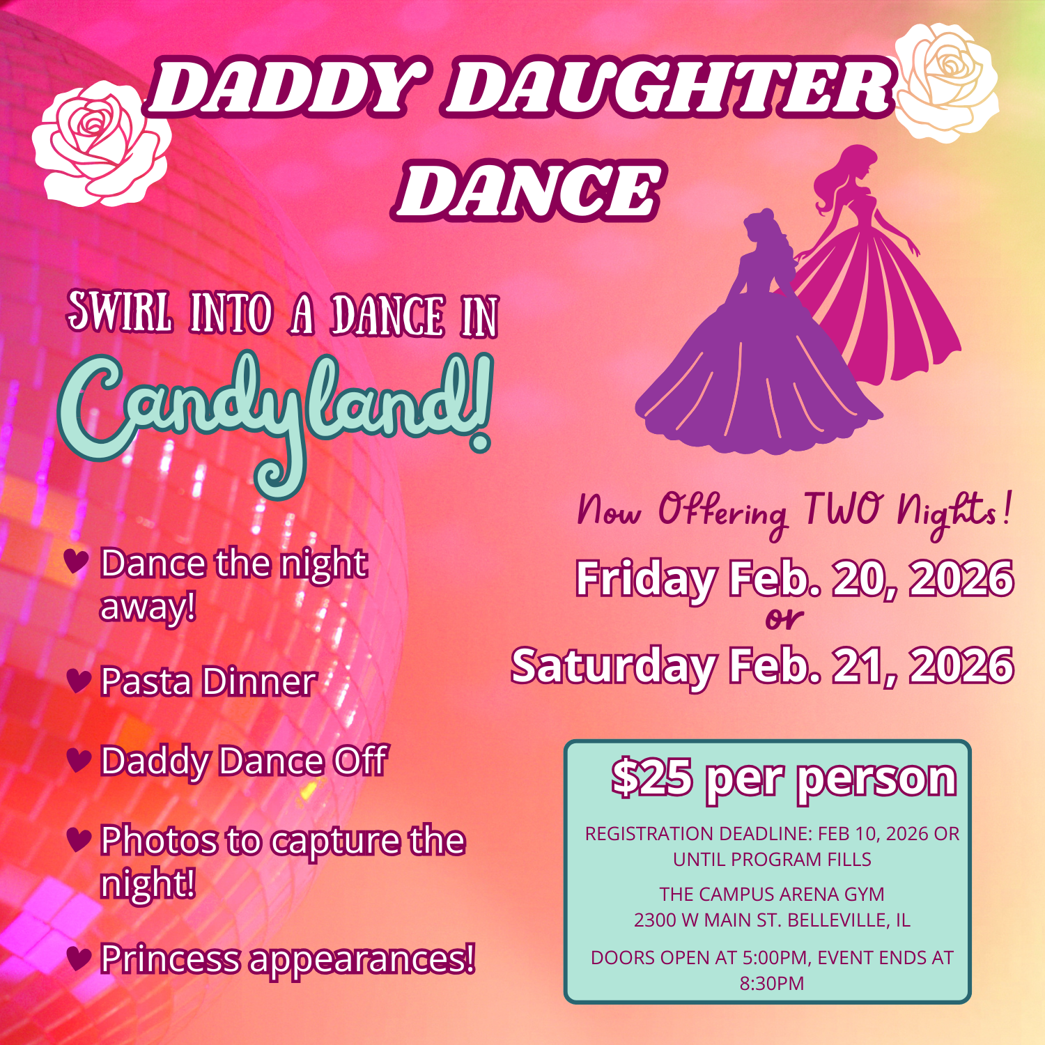 Join us for an evening full of dancing, laughter, and sweet memories at our annual Daddy Daughter Dance, a heartfelt tradition in Belleville for over 20 years! Dress your best and enjoy a pasta dinner, music, photo ops, and even guest appearances by some of your favorite princesses! Don’t forget to practice for the Daddy Dance Off with jumbo prizes on the line! This event is very popular and space is limited, so get your tickets early!