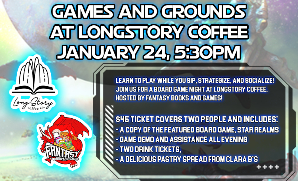 Join us for our fifth board game night with Fantasy Books Inc at LongStory Coffee. Each event ticket is good for two people and includes two drink tickets, a pastry spread, and your board game! Doors open at 5:30pm and the games start around 6:15pm.