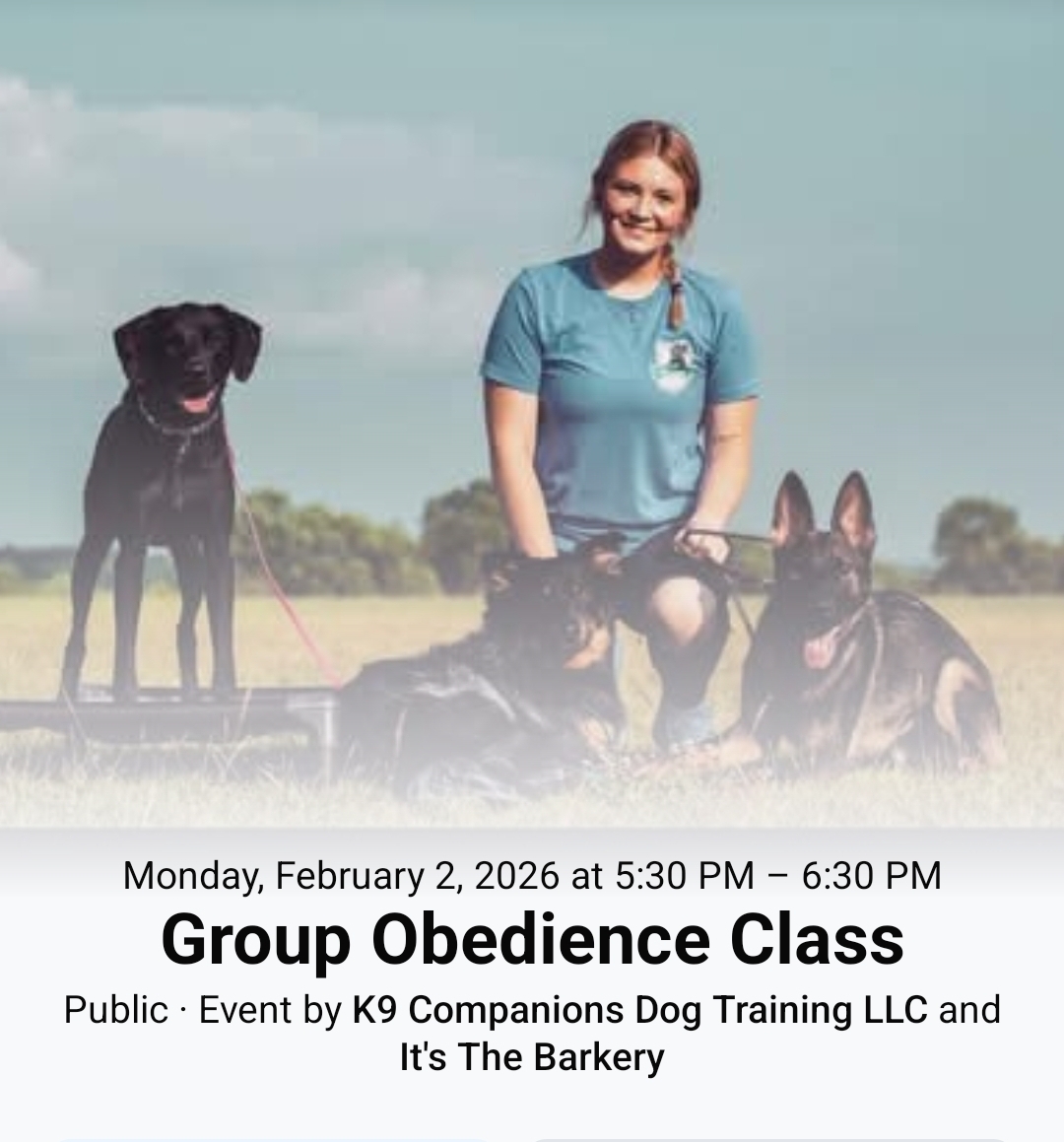 K9 Companions Dog Traning, LLC has partnered with The Barkery to offer group training classes on the first Monday of every month!
