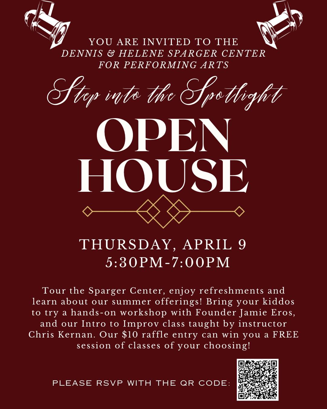 Tour the Sparger Center, enjoy refreshments, and get a sneak peek at our summer offerings. Kiddos can jump into a hands-on workshop with Founder Jamie Eros and an intro to improv class with instructor Chris Kernan!
