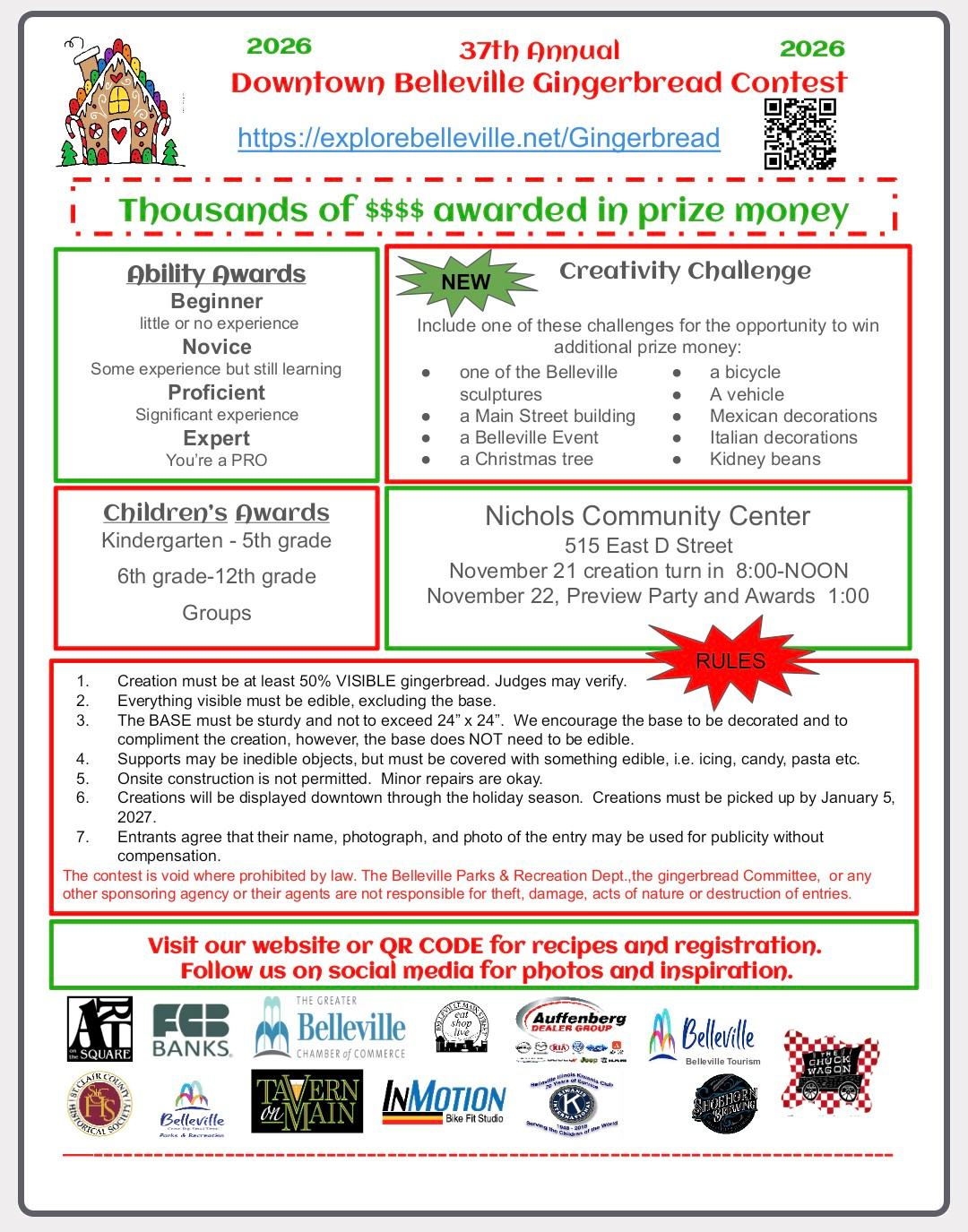 An annual celebration of confectionary creativity, the Downtown Belleville Gingerbread Contest is organized by Belleville Parks and Recreation and the Gingerbread Committee with prize money in the thousands awarded each year.