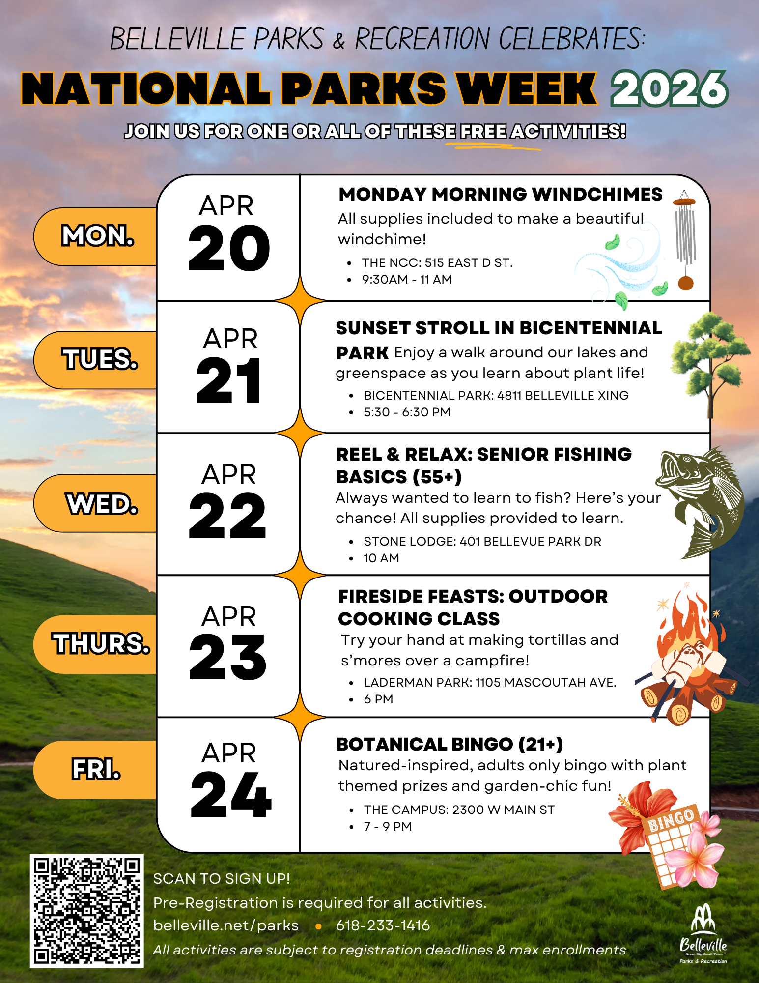 515 East D Street 515 East D Street, BellevilleFREE NATIONAL PARKS WEEK EVENT! Join us on Monday, April 20, 2026, for a windchime making event! Come ready to build and assemble your own enchanting windchime, perfect for enjoying the breeze in spring gardens and backyards! Parent or guardian […]