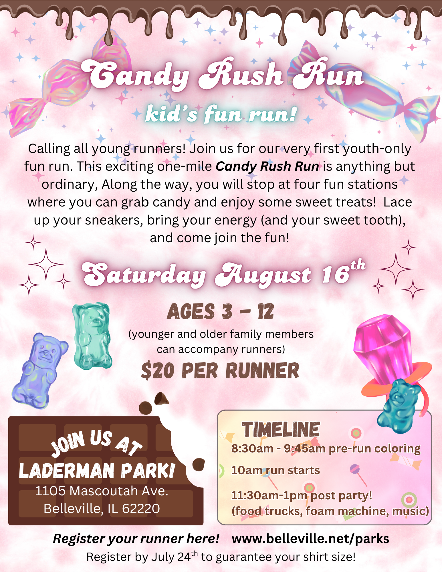 Laderman Park 1105 Mascoutah Ave., Belleville, United StatesCalling all young runners! Join us for our very first youth-only fun run. This exciting one-mile Candy Rush Run is anything but ordinary, Along the way, you will stop at four fun stations where you can grab candy and enjoy […]