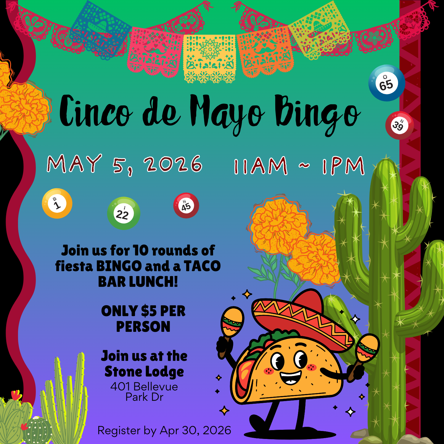 Stone Lodge 401 Bellevue Park Dr, BellevilleJoin us as we continue the Cinco de Mayo celebration with 10 rounds of Fiesta Bingo and a scrumptious Taco Bar! All for just $5 per person!